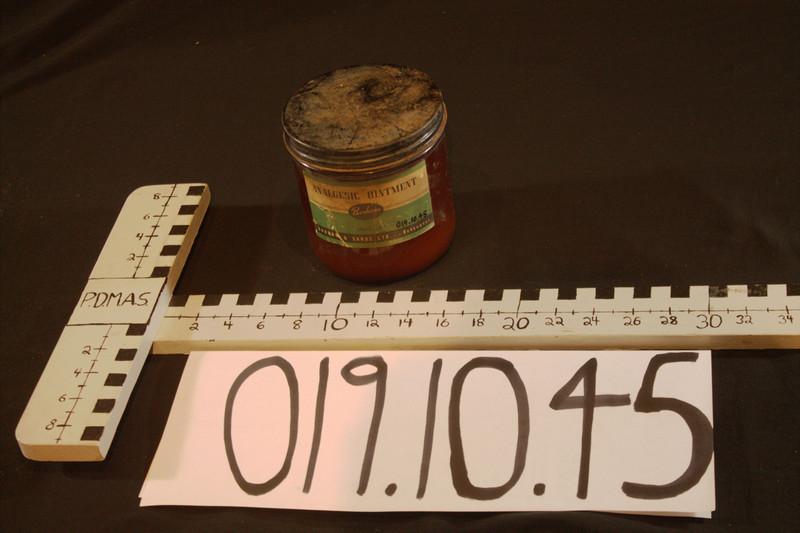 A glass jar of analgesic ointment manufactured by Barham and Sands Ltd. – Vancouver. Used to treat minor aches and pains of the muscles/joints (e.g., arthritis, backache, sprains). First aid supplies associated with Perkins Brothers logging.