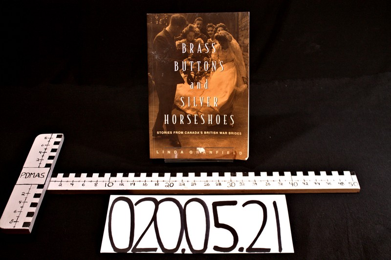 A softcover book that is cream in colour (back) and has a picture of two men in tuxedos and four women as brides (front) titled “Brass Buttons and Silver Horseshoes – Stories From Canada’s British War Brides” by Linda Granfield. It was published by McClelland & Stewart LTD., Toronto, Ontario. 2002. 140 pages.