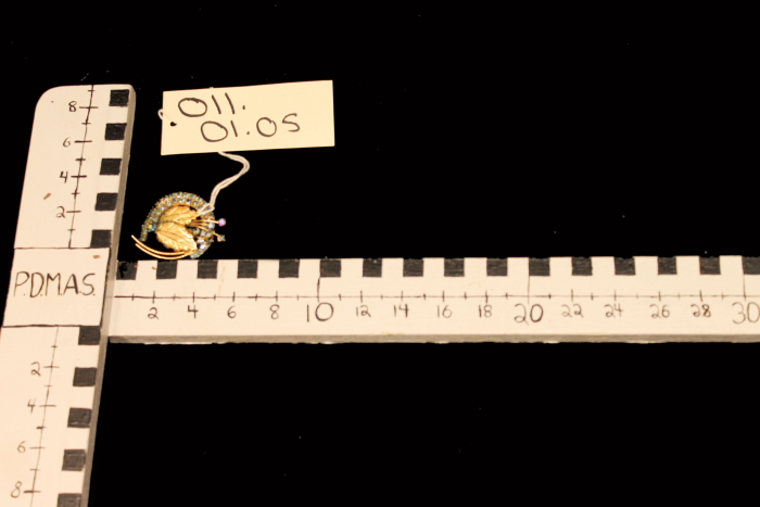 From a batch of items donated by Sue Nelson. Items belonged to her aunt Rosie Wallace who was the daughter of Maggie Saul. Gold coloured brooch with blue stones. Shape is circle around outside with two leaves in the middle and wires sticking out the top of the circle with stones on the ends. There are two rows of stones around the circle. Condition is good. Quite dirty.