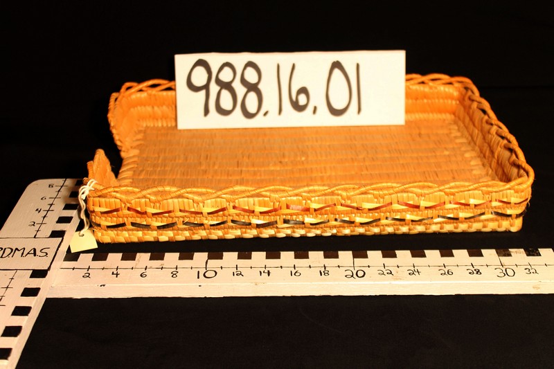 Tray is made primarily of cedar root, the base of strips of cedar tree. Black and red designs made of wild cherry bark, and the white shiny pieces are made of sun bleached straw. The basket tray has a double braid on the top. Made by Margaret Lester from the Lil’wat nation. Margaret specified that the tray be put on Katherine Wallace’s desk and there it used to sit holding pencils, scissors etc.
