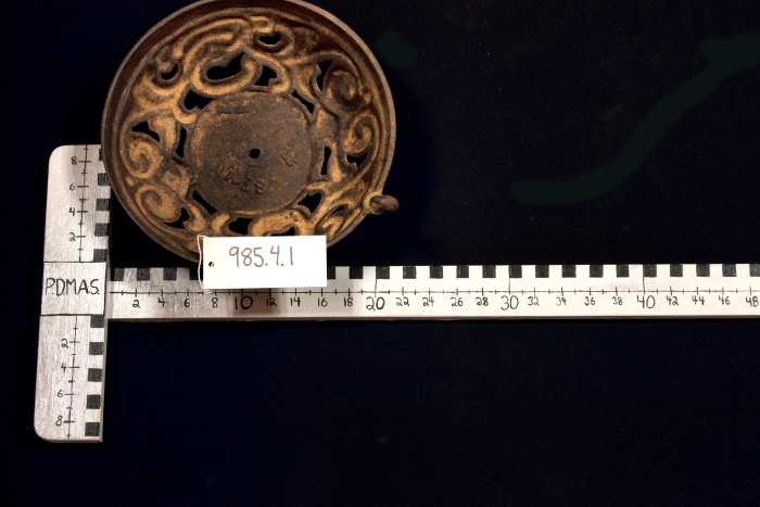 This is a small coal-oil heater. It is a cast iron cylinder of about 68 cm. in height , including an ornamental top. It has a handle near the top. It is black in colour. Condition: it is in good condition showing little signs of rust.