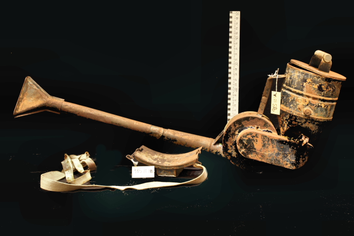This item is 103 cm long and the back “machinery” is 39 cm tall. It is composed of all metal. It was once used to dust crops. It [was] packed with dust but otherwise it is in good condition.