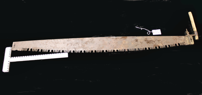 This cross cut saw originally had two handles. Two people would pull the saw causing the teeth to strip the wood and cut. It is made of metal and has a wooden handle. Condition: it is badly rusted, one handle is missing.