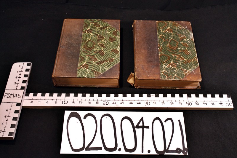 Two brown and green patterned hardcover books both titled “Edinburgh – Picturesque Notes” a) and “Virginbus Puerisque – And Other Papers” b). Both are by Robert Louis Stevenson and published by The Co-Operating Publication Society, London and New York. Donated by Arvin Starks that belonged to Frances Decker. 190 pages a) and 216 pages b).