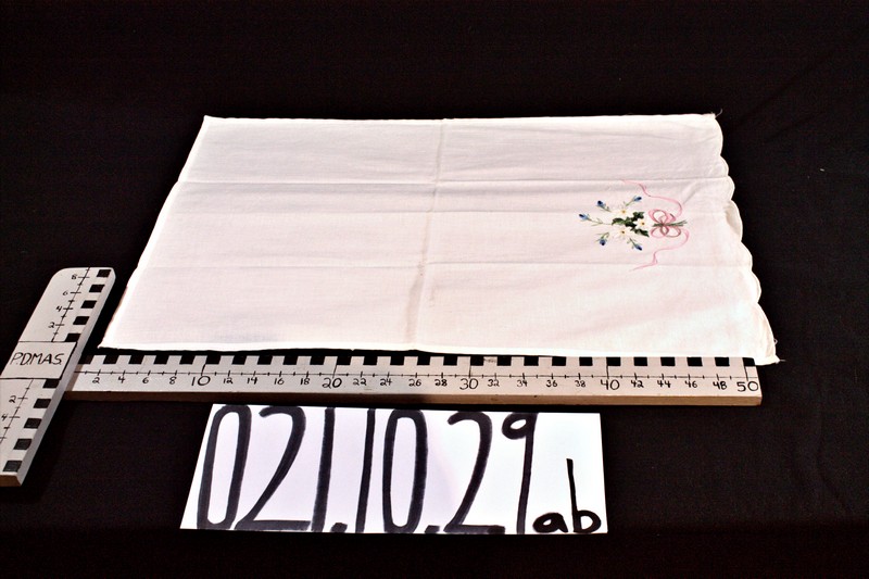 Two white hand made embroidered table cloths that have one identical embroidered design on the bottom that were made by Teresa Summerskill and they were donated by Laura Burden. The small embroidered design on both cloths is a bunch of flowers with a pink ribbon tying them together, with five budded flowers and three daisies. The embroidered designs also have the same colours of white, yellow, brown, light blue, dark blue, pink, light green, and dark green. The material could possibly be made out of 100% polyester. For donor biography see description for 021.10.01.