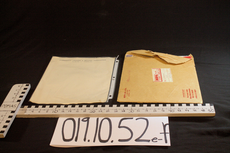 e) Blank 8 and a half X 11 letterhead paper that reads “Pemberton Logging and Milling Association”. f) Manufacturer Info sheet for a “Presto CB” Fire Extinguisher in original 3rd class mail envelope.