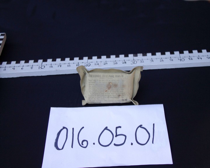 This is a first field, mark III first aid dressing from the 1940s used by Molly Ronayne in the WWII era. This is a “first field, Mark III” first aid dressing pack from the 1940s. It was made in Toronto, Ontario by the rondall company and used by molly Ronayne in WWII era. Molly Ronayne was involved with NAAFI and helped run kitchens associated with relief efforts.