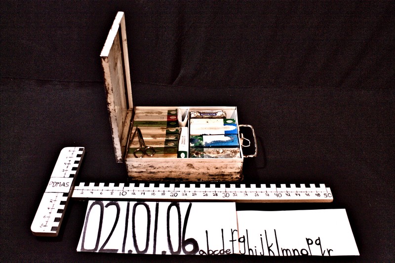 A metal first aid kit that is white in colour a) titled “First Aid- Safety Supply Company – British Columbia No. 1 Kit” on the front and it was donated by Katrina Chevrette. It was found on the McEwan farm. It was manufactured by the Safety Supply Company brand in Vancouver, Victoria, British Columbia. It was shown on a printed label inside the kit, which also describes some of the packet content that is required from each branded kit (No. 01 kit, No. 1., No. 2). The first aid kit comes with a Sentinel Instructions pamphlet, two Hand Cleaners and Gauze Sponges in a packet b) and c), three Adhesive Dressings d), e), and f), one 2″ Compress Bandage and one 4″ g) and h), one Burn Treatment i), one Compressed Gauze j), one Triangular Bandage k), one Adhesive Tape and Roller Bandage l), one Antiseptic m), two Sterile Eye Pads and Adhesive Eye Strips along with Ophthalmic Ointment n), one Sucrets Sore Throat Lozenges tin with a small pill wrapped up in plastic o), one Red Bird small matches box p), and one pair of scissors and tweezers q) and r). The kit is wrapped up in duct tape on the back. It also has a strong, tangy odor when opened.
