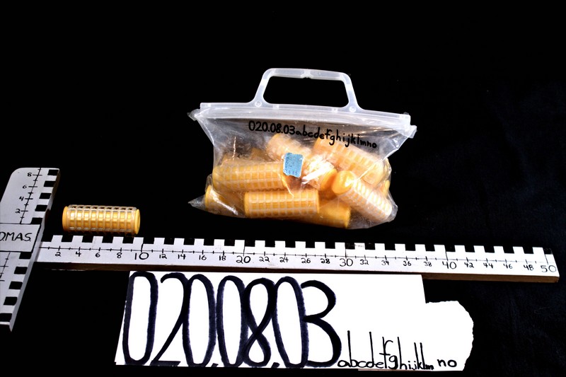 Multiple yellow hair curlers with a plastic covering sealed in a plastic bag and it was donated by Clara Ronayne. The plastic bag also has a blue price tag on the front from Eaton’s that reads “$16.95”. The curlers are assumed they are from the 1960s era.