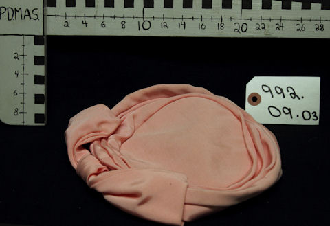 Pink Party Hat: draped turban style. Pink silky ribbed taffeta It has a pink bow of the same material Partially lined with silk(?) There is stiffening material around the crown. “Lady Eade Original Label” Another label referring to size 22