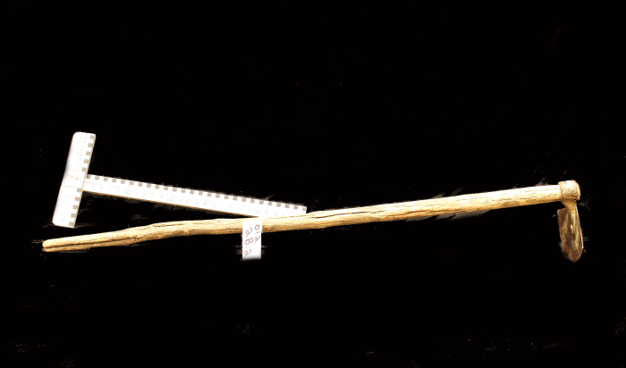 Hoe. Head is triangular with one rounded side with a wooden handle.