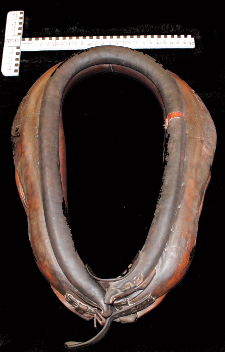 A horse collar is a part of a horse harness device used to distribute a load around a horse’s neck and shoulders when pulling a wagon or plough The item has a red metal band on the right side of collar.