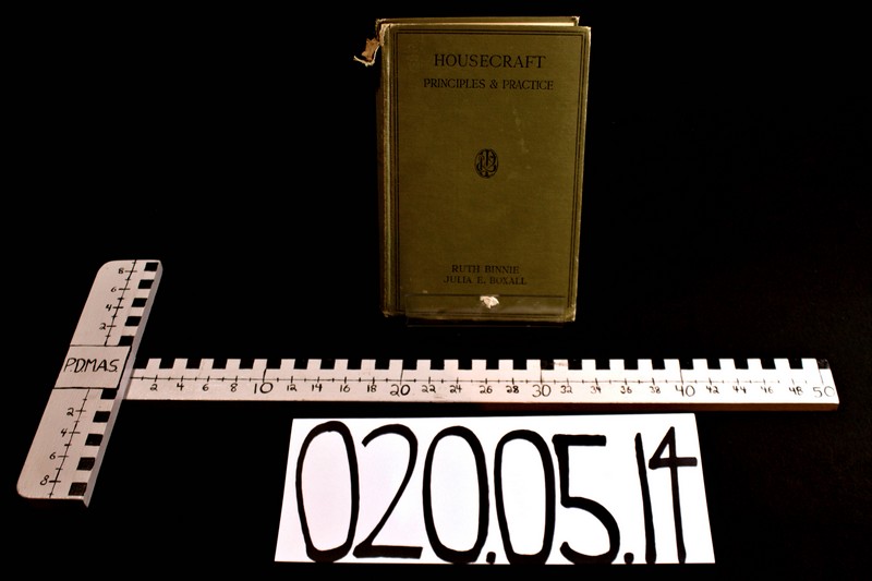 A sage green hardcover book titled “Housecraft Principals & Practice” by Ruth Binnie and Julia E. Boxall. It was published by Sir Isaac Pitman & Sons, LTD., Melbourne, London. 1937. 292 pages.