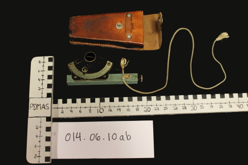 Level with case, Maker’s mark visible: “Leopold Abney Level U.S. Patent 2.137.776. Leopold & Stevens Instruments, Inc. Portland, Oregon”. Case is brown leather and, makers mark visible at the top “Leopold”. Level has a green base, dial is metal. Numbers and markings on the dial are all still perfectly visible. String is attached but is dirty.