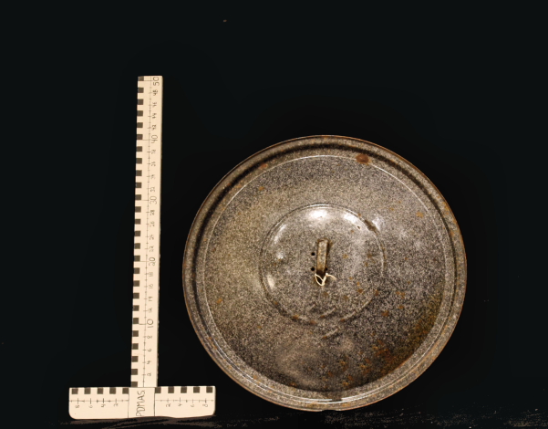This is a lid for a canner (?), a large enamel coated pot. Materials include metal and enamel.