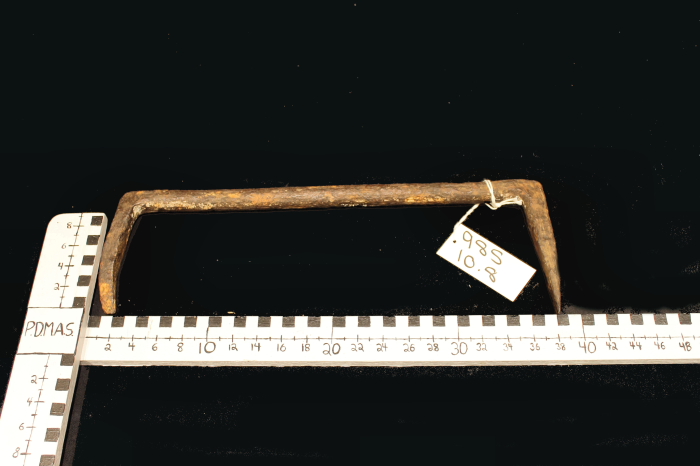 This is a piece of metal bent at both ends. The ends are sharpened into spikes. It was for holding logs together. Condition: rusted. bent bar