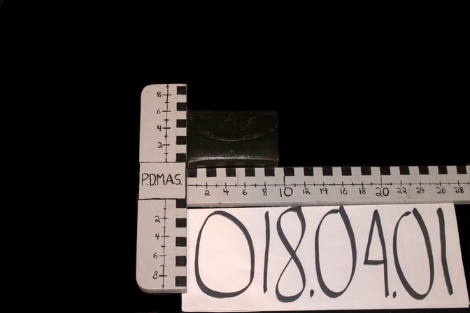 A very dark green leather mending kit inside there is green, grey, red thread; and a little white cloth. Donated along with buttons from Sally Purdens uniform.