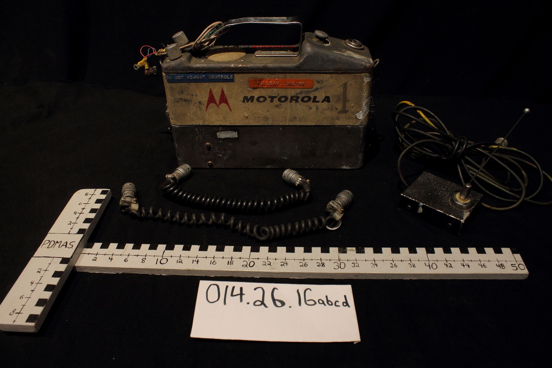 Motorola “Handie – Talkie” FM radio phone that was used by Valleau logging in the 1980s- 1990s. Orange label affixed reads “166.14/2100′ also “do not adjust controls”. Item is a rectangular in shape with an on/off icon + two turning knobs marked “A”+”S”. The bottom compartment snaps off and would have held the battery. Two wires extend from the bottom. There are two radio jacks and one antenna and wires. This type of unit greatly improved communication between the yarder operator and the men on the ground, improving safety and productivity at work. See accession # 014.26.01 for history.