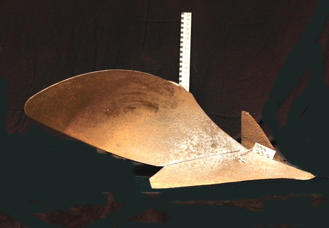 Horse drawn mold board plough lacks frame. Has three main parts: 1) steel fin to cut the soil vertically. 2) steel plough share (at base), pointed in front, sheared off at right angle in rear. Share cuts horizontally. 3) mold board, rusted curved iron plate to receive soil cut loose and turn it over. Condition: rusted and lacking a frame. The late Jake Lokken used it. When his grandson Don Summerskill, sold the farm he left the plough at Fougberg’s.