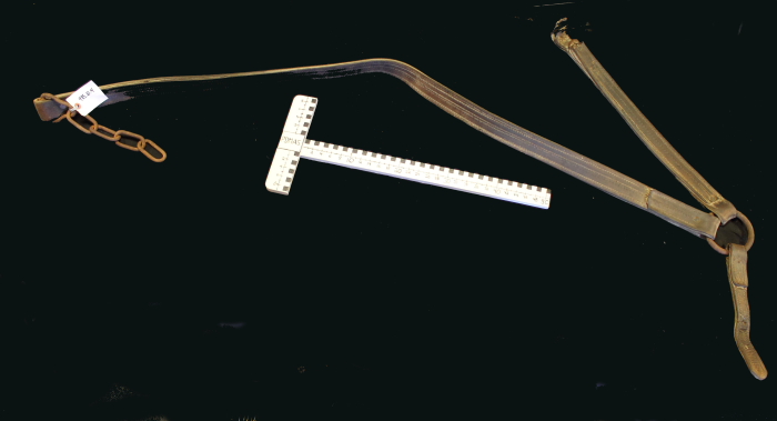 This part of the harness is the long leather hames. It has a chain on one end followed by the leather. A ring then joins the leather to a belt like piece with hole and a buckle. It is very worn.
