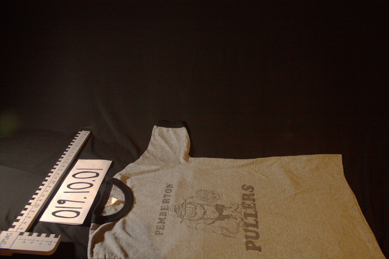 ”Pemberton Pullers” Baseball team t-shirt donated by Ola Perkins. It was manufactered in Evergreen Sportswear MFG LTD. It is gray and black Baseball team t-shirt that is size large and also made from 50% polyester and 50% cotton with a cartoon version of a man holding beer with the caption ”Pemberton” up top and ”Pullers” at the bottom.