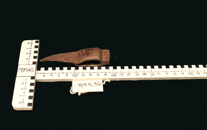 Made of steel, now rusted and pitted. Used to hook and move logs, on land or in water. Handle is missing. This tool has been common in Pemberton. In the “McLennan, McFeely & Prior Limited”, January 1952 catalogue, the handle is described as 34-inch hardwood.