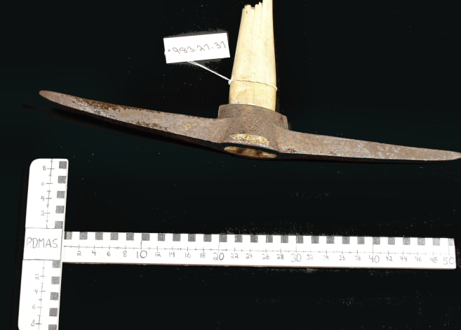 The wooden pick handle is much worn, rotting near its base and farther up, mended with electric tape. Perhaps Mr. Walker was thinking of another pick when he told me of discovering a cache of unused picks when he cleared away a collapsed root house to make way for his present house. Samuel (A.W.) Spetch must have intended them for sale.