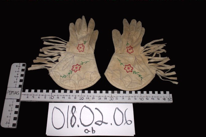 Two white cloth rodeo gloves most likely for a woman. On each glove there are two flowers, one on the top with a short stem and one on the bottom on a vine. The flowers have pink centers, yellow lines in the middle, and a red outline. There is also purple decorative stitching. The items belong to Allen McEwan’s grandmother and grandfather, Bertha (nee Collins) and Morgan Miller. Jean McEwan, Allen’s mother, put the donation box together.