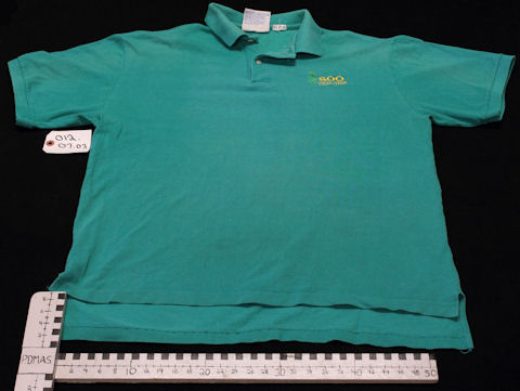 Green polo shirt. On front at top on viewer’s right is “Soo Coalition” embroidered front left chest in yellow thread. Tag; “Hanes activewear ™, 100% cotton, fabric made in USA/assembled n Dominican Republc – X-large, Washing symbols”.