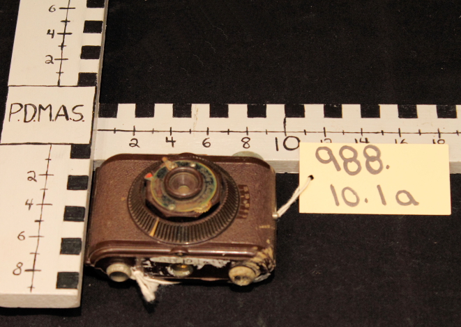 This is a small camera and case. Camera is brown with a metal case, single lens, few adjustments. One corner is damaged. Inscription reads “Baby Ruby”, no serial number. Remote control accessory in hand sewn leather case. Case and camera and accessory very much used and neglected. History: in the 1930’s Mr. Fougberg carried this camera in the mountains when he was trapping and prospecting. He made the case from buckskin. [see 013.21.61].