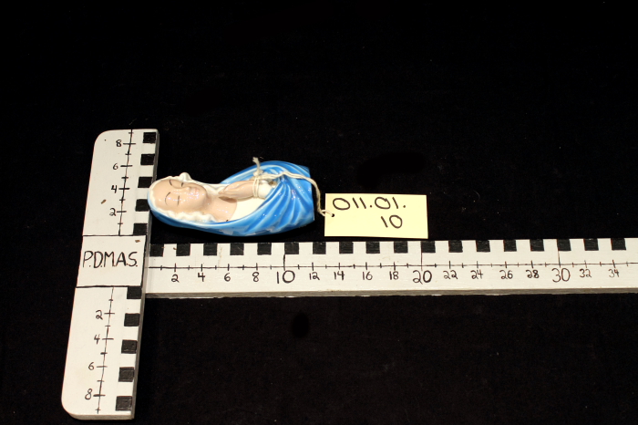 From a batch of items donated by Sue Nelson. Items belonged to her aunt Rosie Wallace who was the daughter of Maggie Saul. Ceramic statue of “Mary” wearing blue cloak draped over head, and white dress underneath. Eyes are closed. Black felt on bottom. Residue of sticker on back. Statue is only upper body. Condition is excellent.