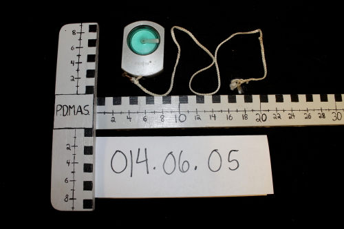 SUUNTO compass for measuring height, clinometers, combined height and clinometer, slopes, vertical angles. Object is silver metal with a green cover where the compass is located. White string attached. Maker’s mark is still visible on the front of the object: “SUUNTO”. There is a hole and the bottom of the object with a glass cover, a little smaller than a dime. There is a chart on the back of the object, on a darker silver plate: reads: 360 Cosine Decimals with a series of numbers. Someone has scratched “M & B” into the side of the object. The serial number of the object is visible on the back: 315367, and it is model PM 5/360 PC which is visible on the compass dial in the centre. Materials are metal, glass, plastic, textile string.