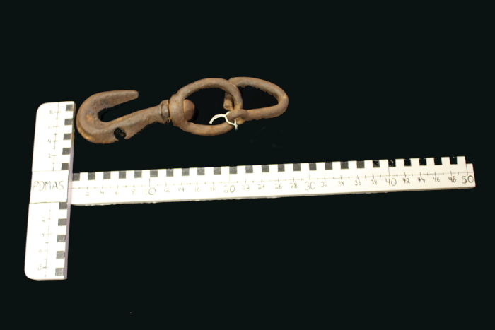 This is a swivel hook. It is comprised of three parts, a hook, swivel and a triangular metal hook with and eyelet for rope. This is an old blacksmith quick link – pre WWII.