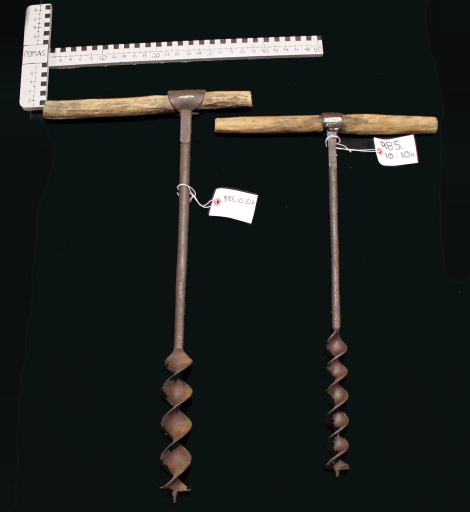 These augers are long rods made of metal. The long shaft is attached to a T-handle and there is a drill bit at the other end. The auger is turned by hand to bore holes on logs and or planks. These two augers were received by the museum with the Sam Jim house.