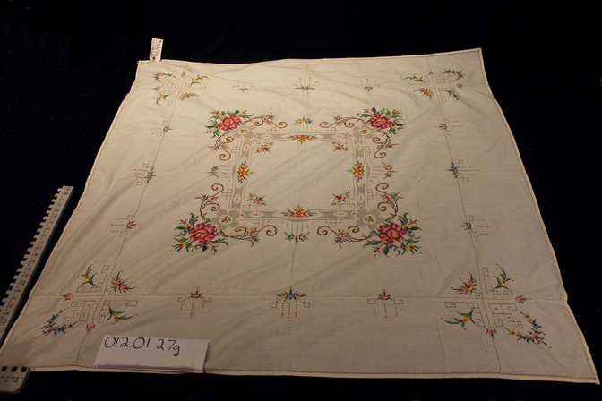 Tablecloth has cross-stitched flower pattern and hem stitching around edge as well as around flowers. Flowers are mostly pink with some yellow orange and blue.