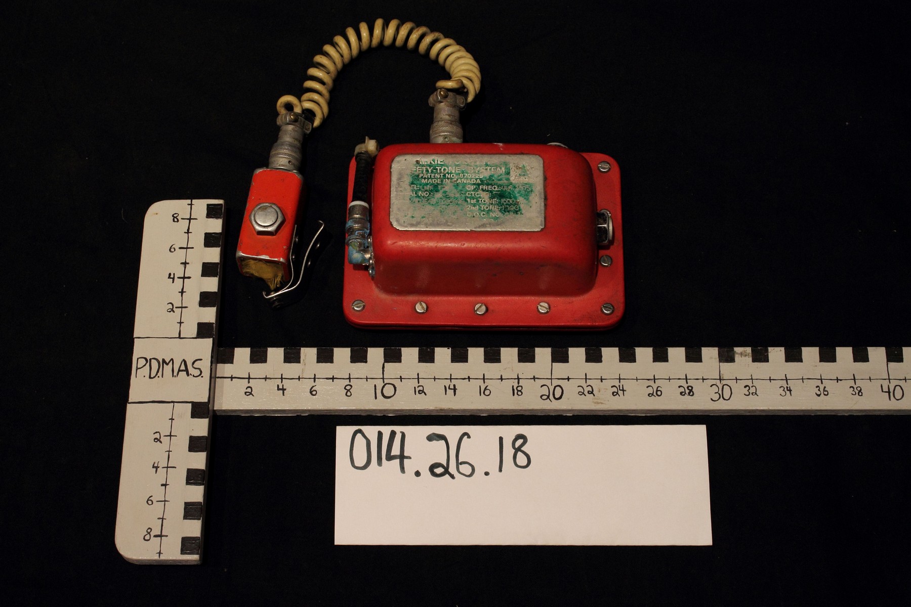A “Talkie Tooter Safety Tone System” patent NO870229, Made in Canada. There is a label on the unit and it is engraved “UHF, freq 469.2375, Valleau logging, Ryan river, 1st tone: 1000 HZ, 2nd tone 1700HZ”. Label is abraded and fading. a) It is a red plastic box with hardware for mounting on a work belt. b) It is a coiled cord with a small red box on one end. This box has a button that would be depressed to speak into a mic so the “riggin’ slinger” (man on the ground) could talk to the operator man in the cab of the steel spar. The mic unit is missing. Used for work safety during yarding operations. See accession # 014.26.01 for history.