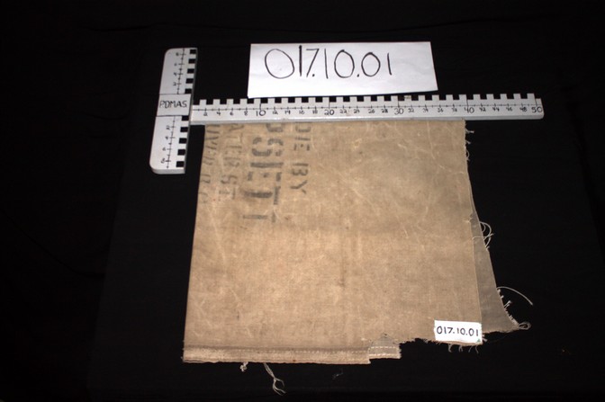 A square piece of greyish brown tent canvas. It has faded writing on it which reads “MADE BY E. LIPSETT 68 WATER ST. VANCOUVER BC.”. The top right corner is ripped. The back is darker in color than the front. Wendy Ireland found this in her wall while doing renovations to her house, which used to be owned by the Gimse family.