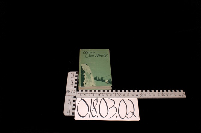 A green text book titled “Using our World” On the cover there is an illustration of a waterfall and a PowerStation. On the spine it reads “Powers. Bruner. Neuner. Bradley; Using our World NEW EDITION”. The book is a geography textbook centered around resource use and management. Inside stamped is “PEMBERTON ELEMENTARY SENIOR HIGH SCHOOL” and “PEMBERTON VILLAGE SCHOOL PEMBERTON, B.C”.
