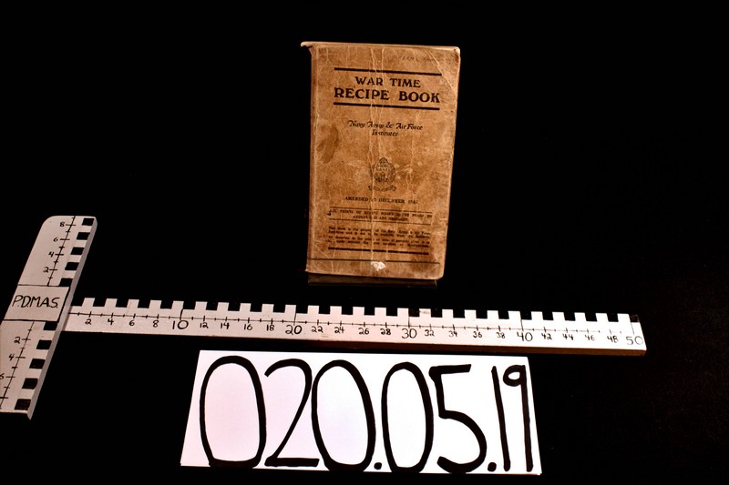 A mottled brown cardboard softcover titled “War Time Recipe Book – Navy Army & Air Force Institutes” by the Navy Army & Air Force Institutes. It was published by the Navy Army & Air Force Institutes, Surrey, England. 1945. 136 pages. Another page cover (salmon pink in colour covers) was found at the back of the book titled “Additional War-Time Recipes”, though it is detached from the book. Some pages that are titled “additional recipes” are blank while others are handwritten, meaning that this page cover was more likely partially used as a reference.