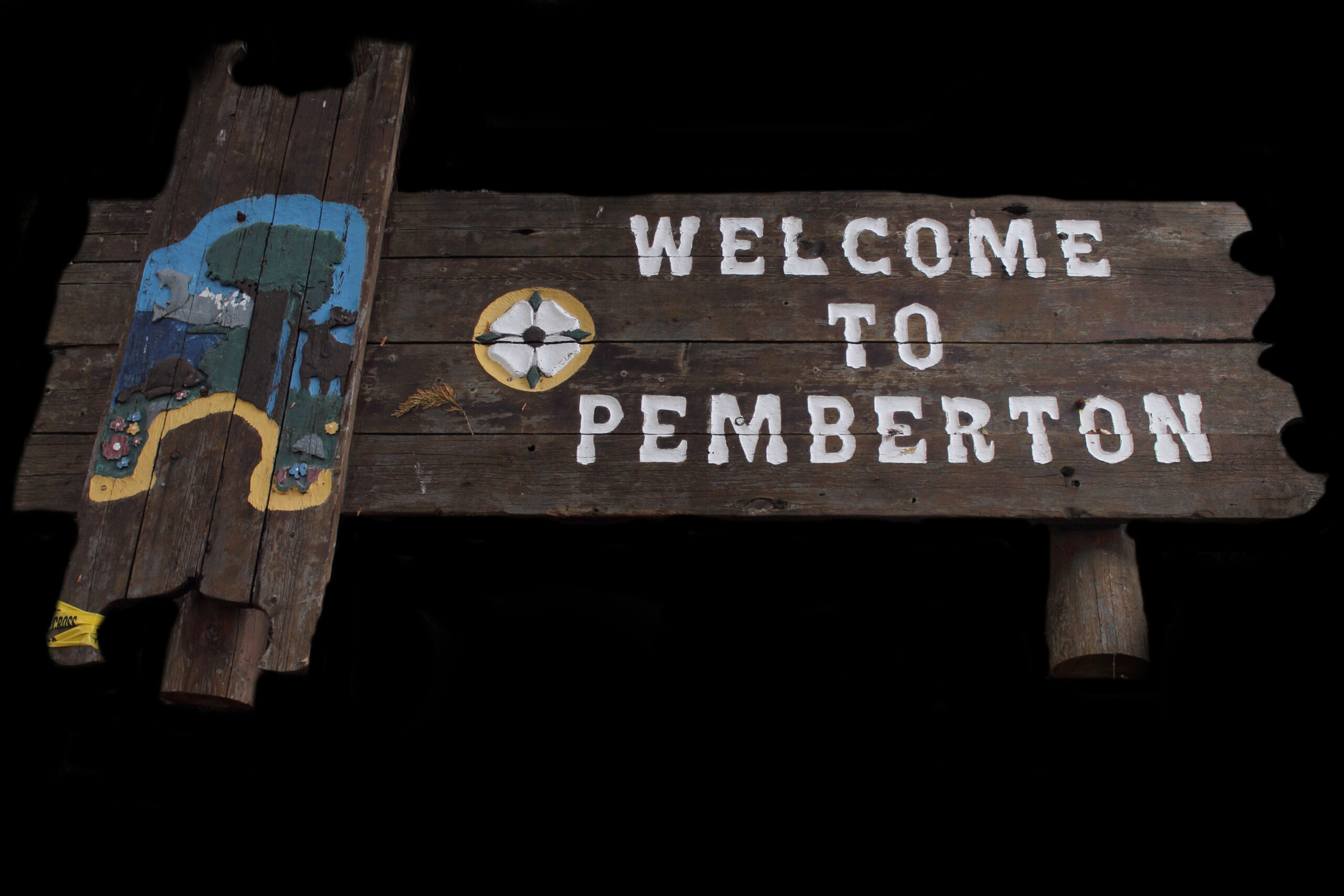 This is the big wooden welcome sign for Pemberton that was located at One Mile lake from 1977 to 2015. It was carved by Mike Smyth and depicts wildlife including a beaver, moose, and tree in a meadow as well as leaping salmon, mushroom and dogwood bloom.