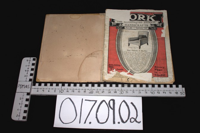 A magazine that belonged to H. Wyatt Purden. It was saved by Betty Cherry who gave it to May Walker to give it to the museum. Titled “Work – the Illustrated Journal of Handicrafts”, Part 341, September 1917. Some damage along the bottom – chewed by rodents.