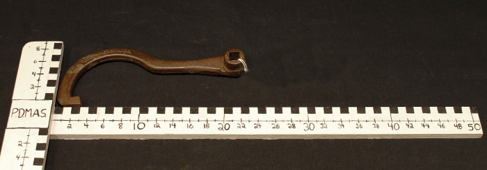 This item is a ‘bung’ wrench for wrenching a cylindrical object. Item has “EMCO Wheaton” embossed on one side and “1.8 Canada” on the other. Estimate item is from 1940 but further research into manufacturer could better determine age.